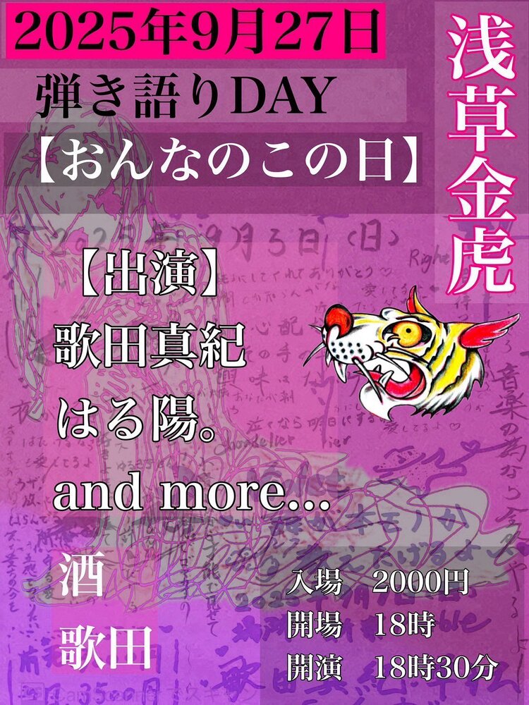 弾き語りDAY 💖おんなのこの日💖 SCHEDULE 2025/09/27(土) 18:30 - 浅草金虎 OPEN 18:00 / START 18:30 w/ はる陽。 and more... URLをコピーする 報告する