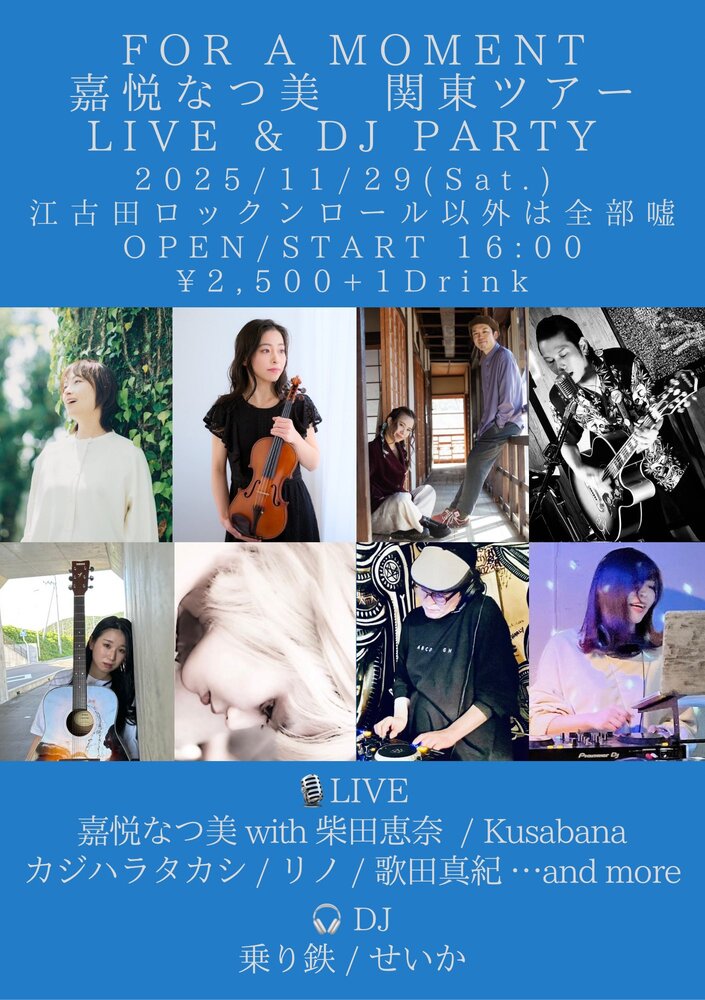 FOR A MOMENT 嘉悦なつ美関東ツアー LIVE&DJ PARTY SCHEDULE 2025/11/29(土) 16:00 - 江古田ロックンロール以外は全部嘘 OPEN/DJ START 16:00 w/ 嘉悦なつ美 w/柴田恵奈/カジハラタカシ/リノ/Kusabana …and more URLをコピーする 報告する